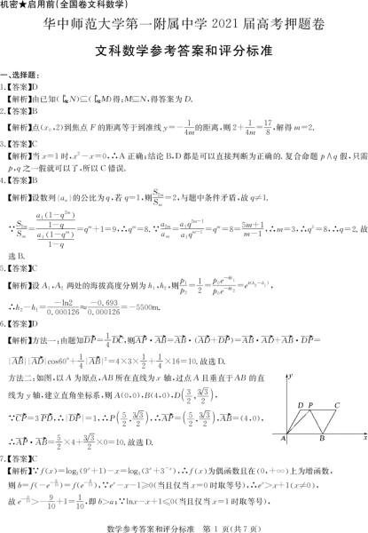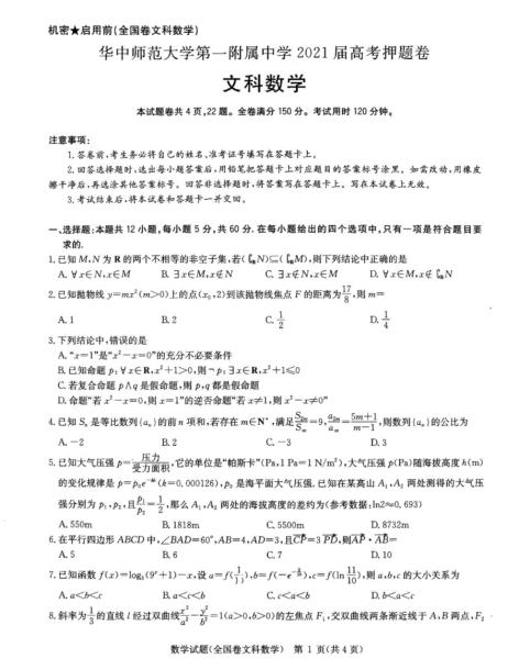 湖北省武汉市华中师范大学第一附属中学2021届高三下学期5月高考押题卷数学(文)试题 PDF含解析.pdf