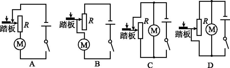 图B,滑动变阻器与电动机串联接入电路中,踏板向下移动,滑动变阻器接入电路的电阻变大,电路中电流变小,故B不符合题意。