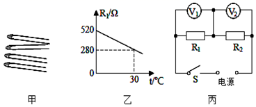 在3D打印笔中装入塑料条,接通电源,等待一段时间后即可挤出热熔的塑料,塑料在空气中迅速冷却变成特定的形态(如图甲)。其内部电路如图乙,R1、R2是相同的PTC发热电阻。单个PTC的电阻与温度的关系如图丙。