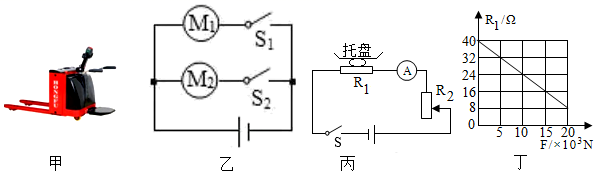 (4)搬运车上有显示所载货物质量的仪表,其电路如图丙所示,电源电压24V,电流表(0~0.6A),滑动变阻器R2(60Ω1A),压敏电阻R1的阻值与所受压力F的关系如图丁所示,由电流表改装的“质量表”显示盘上的刻度在最_____边是最大值(选填“左”或“右”),为了确保此电路能安全工作,R2的阻值应至少调至_____Ω,若在使用过程中不小心将R2接入电路的电阻调大,那么“质量表”显示的所载货物质量比实际值偏_____(选填“大”或“小”)。