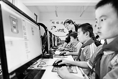 河北省滦州市第四实验小学老师在下午放学后指导学生练习计算机编程。