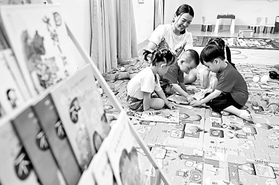 福建省晋江市第十实验小学教师子女托管室,老师为幼儿园放学后的孩子们讲绘本。