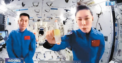3月23日,航天员王亚平(女)与叶光富在演示太空水油分离实验。 |
