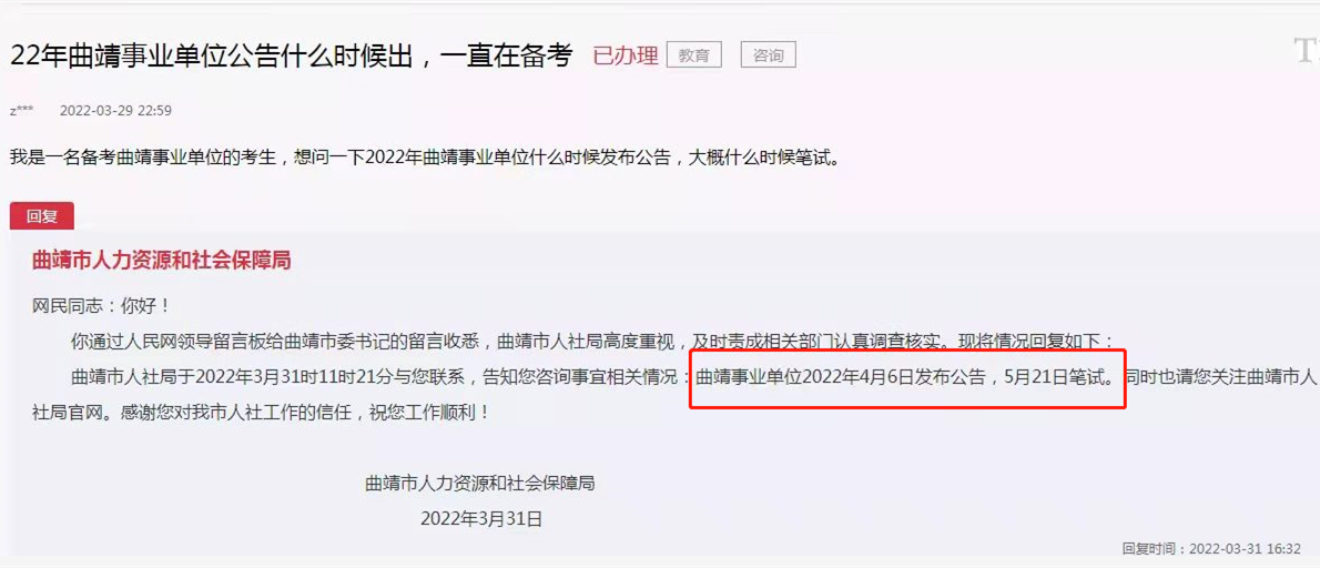 重要消息!官方回复:2022年云南事业单位5月21日举行笔试!曲靖已定4月6日发布招考公告~详见下图↓↓↓