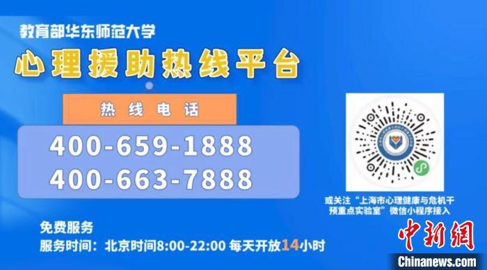中新网上海4月15日电 (记者 陈静)记者15日获悉,受教育部委托,华东师范大学心理与认知科学学院、上海市心理健康与危机干预重点实验室,面向全社会开通“教育部华东师范大学心理援助热线平台”,向大众提供疫情相关的心理援助热线和网络支持服务,并探索创造出一种全新的高校服务于地区和区域疫情防控的心理援助体系。