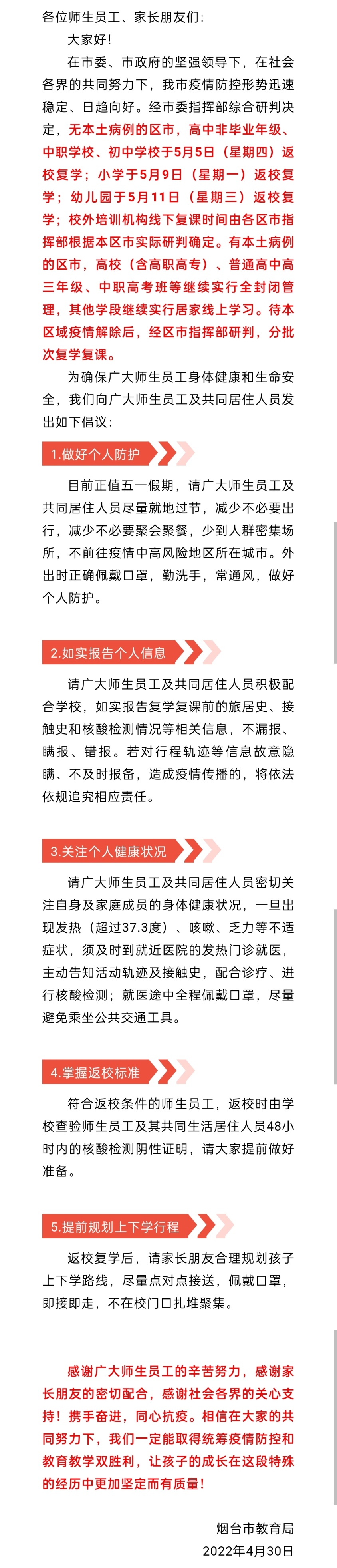 4月30日晚,山东烟台市教育局发布复学复课公告。公告指出,烟台市疫情防控形势迅速稳定、日趋向好,经烟台市委指挥部综合研判决定,无本土病例的区市,高中非毕业年级、中职学校、初中学校于5月5日(星期四)返校复学;小学于5月9日(星期一)返校复学;幼儿园于5月11日(星期三)返校复学;校外培训机构线下复课时间由各区市指挥部根据本区市实际研判确定。有本土病例的区市,高校(含高职高专)、普通高中高三年级、中职高考班等继续实行全封闭管理,其他学段继续实行居家线上学习。待本区域疫情解除后,经区市指挥部研判,分批次复学复课。