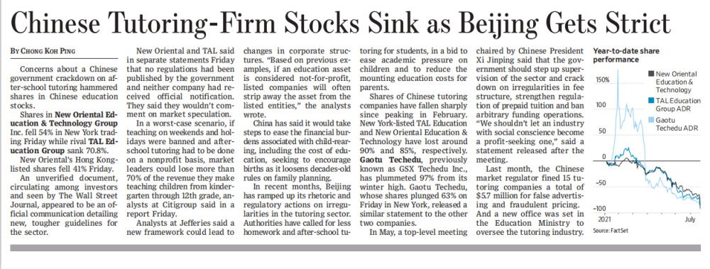 多家海外媒体也对此事件表示了高度关注,其中华尔街知名投行(Jefferies)分析师表示,新的市场环境可能导致教育培训类公司结构发生变化。“根据过往案例,如果教育资产被认为是“非盈利”时,上市公司可能会从上市实体中剥离该资产。”