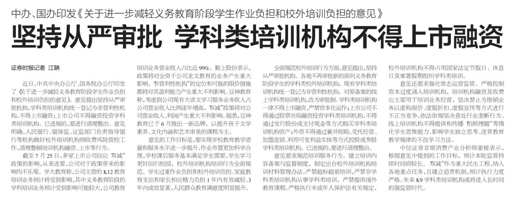 据新华社北京7月24日电。近日,中共中央办公厅、国务院办公厅印发了《关于进一步减轻义务教育阶段学生作业负担和校外培训负担的意见》(简称“双减”),并发出通知,要求各地区各部门结合实际认真贯彻落实。