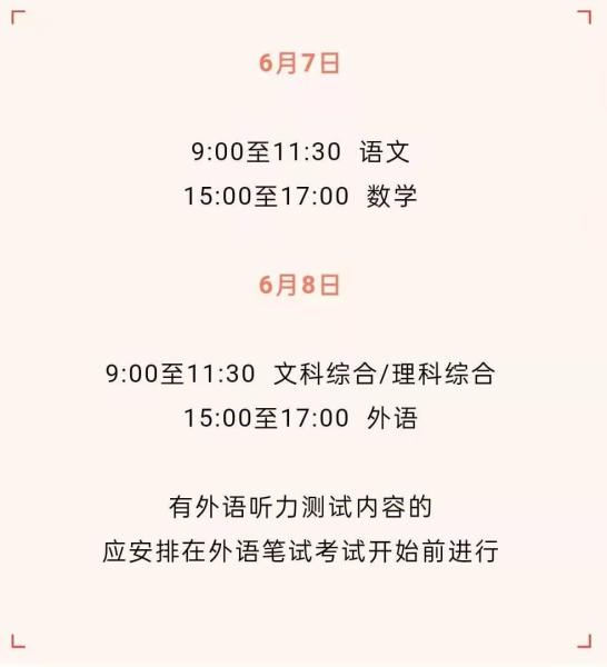 在通知附带的《2021年普通高等学校招生工作规定》中明确,全国统考于6月7日开始举行,具体科目考试时间安排为: 各省(区、市)考试科目名称与全国统考科目名称相同的必须与全国统考时间安排一致。具体考试科目时间安排报教育部考试中心备案后发布。 省级统考和高校的招生考试时间,分别由各省级招委会和高校按照教育部有关要求确定并发布。 今年的高考亮点 1. 为每个考点配备防疫主考 教育部要求,健全疫情防控常态化下高考组织工作机制。结合疫情防控实际,进一步细化组考防疫工作方案,制定疫情防控工作标准,强化命题制卷、考点考场、评卷等场所防疫举措;做好考生和考务人员日常体温测量和身体健康状况监测,按要求为每个考点配备防疫副主考,设置必要的隔离考场、隔离设施,配备充足的防疫物资等。 2. 贫困县脱贫后仍可享专项计划 各地各校要继续实施国家支援中西部地区招生协作计划,综合考虑生源数量及学校办学条件、毕业生就业状况等因素,继续将招生计划增量向中西部地区和考生大省倾斜。 按照中央脱贫攻坚有关部署,专项计划实施区域的贫困县脱贫后2021年仍可继续享受专项计划政策。 3. 今年高考试题开放性增强 教育部要求,稳妥推进高考综合改革。 河北、辽宁、江苏、福建、湖北、湖南、广东、重庆等第三批高考综合改革省份要全力做好新高考落地的各项工作,精心制定命题、考试和录取工作方案; 上海、浙江、北京、天津、山东、海南要进一步总结完善试点经验,不断研究解决改革过程中遇到的新情况、新问题。 通知要求,各高校要加强与中学人才培养衔接,完善综合素质评价使用办法并向社会公布,逐步转变简单以考试成绩为唯一标准的招生模式。 2021年高考命题要坚持立德树人,加强对学生德智体美劳全面发展的考查和引导。要优化情境设计,增强试题开放性、灵活性,引导减少死记硬背和“机械刷题”现象。 4. 深入实施强基计划,优化校考内容和形式 教育部要求,要优化高校考核的内容和形式,充分运用考生综合素质评价档案,考查思想品德、专业兴趣、科研志向以及吃苦耐劳的精神等,着力选拔“有志向、有兴趣、有天赋”的优秀学生。 各地各校要统筹安排高职分类招考计划,重点向区域经济建设急需、社会民生领域紧缺和就业率高的专业倾斜;逐步取消中职本科贯通招生,适当在学前教育、护理、养老、健康服务、现代服务业等领域扩大中高职贯通招生规模。 5. 高考分数不提供给考生所在中学 各地要开展招生秩序专项治理,严肃查处违规宣传、通过设置奖金等方式违规争抢生源、违规承诺录取等行为。 除教育部规定的特定事项外,只能将考生的高考成绩信息提供给考生本人及有关投档高校,不得向考生所在中学及其他任何单位和个人提供;严禁宣传炒作“高考状元”“高考升学率”“高分考生”等;严禁各地政府、学校、培训机构以高考成绩为标准奖励教师和学生。 6. 烈士子女等最多可加20分 《规定》明确,对于烈士子女;在服役期间荣立二等功以上或被战区(原大军区)以上单位授予荣誉称号的退役军人;边疆、山区、牧区、少数民族聚居地区的少数民族考生;归侨、华侨子女、归侨子女和台湾省籍(含台湾户籍)考生,省级招委会可根据本地投档录取办法决定,在其文化统考成绩总分的基础上增加一定分数投档;达到高校投档条件的,由高校审查决定是否录取。同一考生如符合多项增加分数投档条件的,只能取其中幅度最大的一项分值,且不得超过20分。 7. 自主就业退役士兵最多可加十分 自主就业的退役士兵,可在其文化统考成绩总分的基础上增加一定分数投档,分值不得超过10分。《规定》同时强调,要精准确定加分资格条件,合理降低加分分值。有关省(区、市)地方性加分政策仅适用于向本省(区、市)所属高校投档时使用,且分值不得超过20分,同时不得与其他项目分值累加。所有高考加分项目及分值均不得用于高校不安排分省招生计划的艺术类专业、高水平艺术团、高水平运动队、高校专项计划等招生项目。 8. 多类考生可优先录取 除军事、国防和公共安全等部分特殊院校(专业)外,高校不得规定男女生录取比例,不得对报考非外国语言文学类专业的考生作统考外语语种限制,不得在国家招生政策规定外作其他限制。 9. 普通高校专业不得规定男女生录取比例 除军事、国防和公共安全等部分特殊院校(专业)外,高校不得规定男女生录取比例,不得对报考非外国语言文学类专业的考生作统考外语语种限制,不得在国家招生政策规定外作其他限制。 10. 合理安排高校录取批次 教育部要求,合理安排高校录取批次。同一高校、同一学历层次、同一招生类型的招生计划在同一省(区、市)原则上安排在同一批次录取。高校中外合作办学专业须与高校在同一地区招生的其他专业安排在同一批次录取。除军事、公安、飞行学员、公费师范生、农村订单定向医学生、部分艺术体育专业、航海类等艰苦专业、全国重点马克思主义学院的马克思主义理论专业以及其他经教育部批准的特殊高校(专业)、有关高校综合评价招生等教育部规定可安排在提前次批录取的情况外,其余高校和专业一律不得安排在提前批次录取。