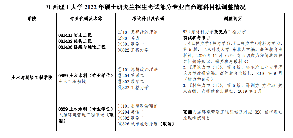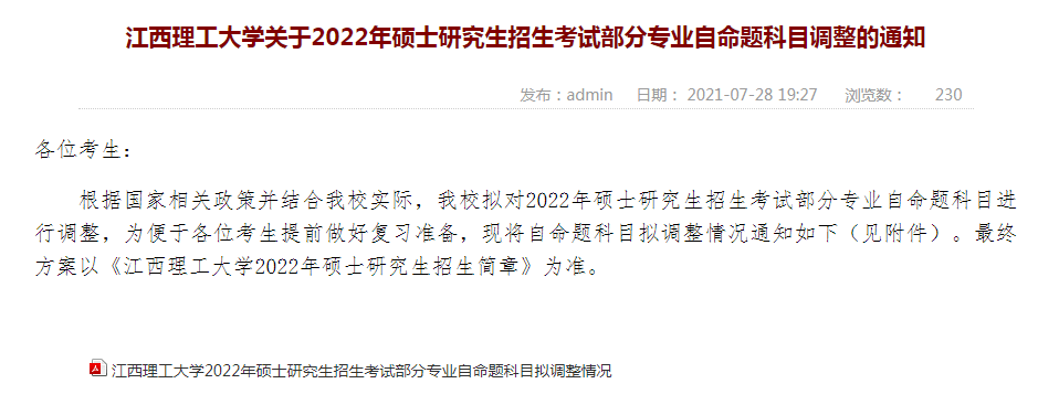 7月28日,江西理工大学发布《江西理工大学关于2022年硕士研究生招生考试部分专业自命题科目调整的通知》,拟对2022年硕士研究生招生考试部分专业自命题科目进行调整。