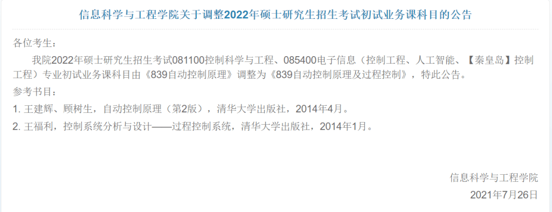 7月26日,东北大学信息科学与工程学院发布《关于调整2022年硕士研究生招生考试初试业务课科目的公告》。