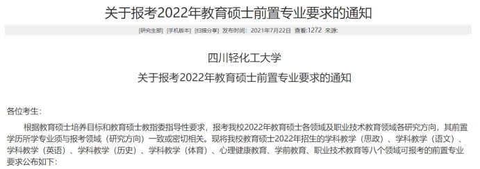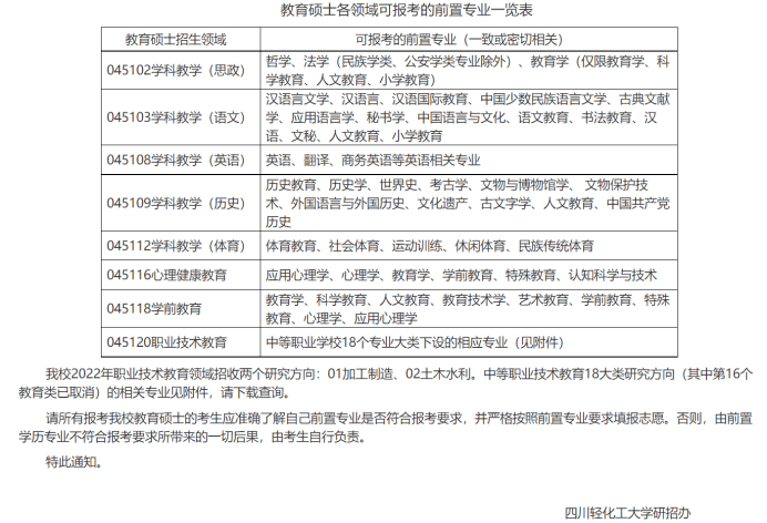 四川轻化工大学发布了关于报考2022年教育硕士前置专业要求的通知。
