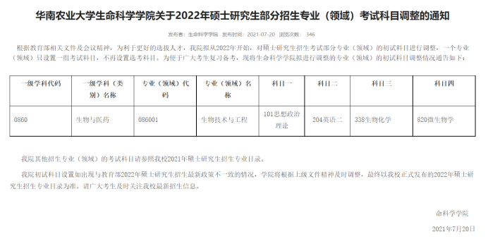 华南农业大学生命科学学院发布了《关于2022年硕士研究生部分招生专业(领域)考试科目调整的通知》。