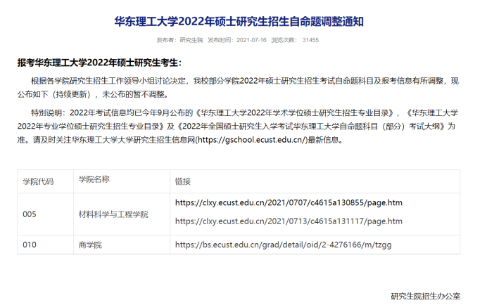 华东理工大学发布《2022年硕士研究生招生自命题调整通知》。