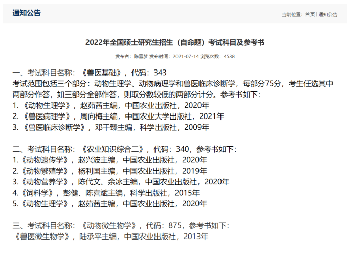 浙江大学动物科学学院公布2022年硕士研究生招生考试科目以及参考书。