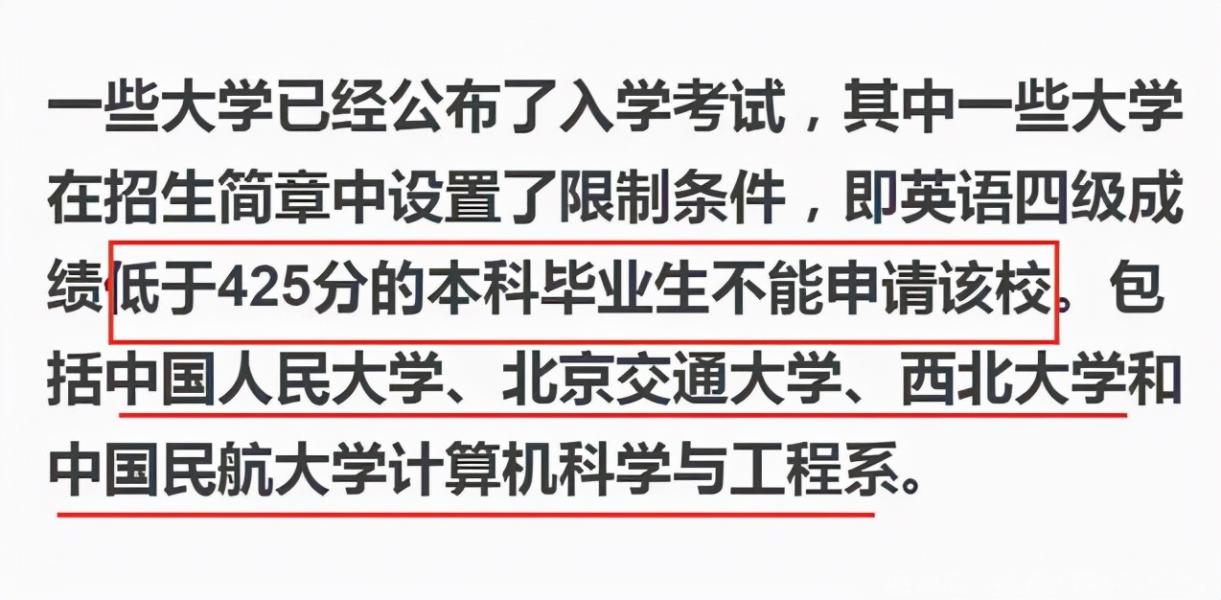 有一些高校对考研党的英语四级要求很严格,像是中国人民大学等,要求考研党的英语四级分数达到425分,也就是“及格”线才允许报考,不然你是没有报考资格的。