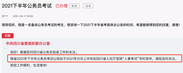 快!2021下半年四川省考有消息啦!近日,中共四川省委组织部办公室在回复网友留言时提及:我省2021年下半年公务员考试公告拟于2021年10月上中旬!在四川省人社厅官网“人事考试”专栏发布。详情如下: