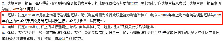 从“2022年上海市崇明招录专业技能储备人才及定向选调生55人公告”一文,我们可以看到,其笔试时间为12月,而它的笔试时间又与2022年度上海市考试录用公务员笔试一并进行。