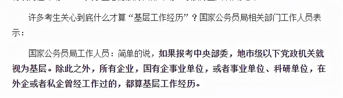 简单的说,如果报考中央部委,地市级以下党政机关就视为基层。除此之外,所有企业,国有企事业单位,或者事业单位、科研单位,在外企或者私企曾经工作过的,都算基层工作经历。