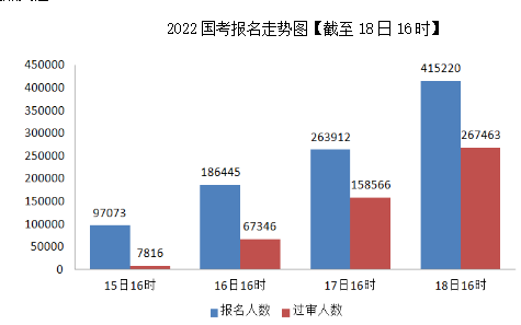 2022国考报名进入第四天,截至18日16时,已有415220人提交报考申请,比单日增长量超15万人,目前通过审核确认可以参加考试的有267463人,比去年同期超十万人以上,平均竞争比为8.56:1,比去年竞争力略低。目前仍有1186个职位无人报考,仅占总职位数的7%,这些“遇冷”的职位竞争力度极低,希望尚未出手的考生引起重点关注。