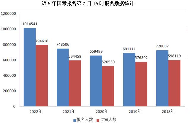 截至21日16时,2022国家公务员考试经过了近7天的报名后,报名系统中共有1014541人提交了报名申请,首次突破百万大关,比去年同期超越了26.6万人,截至21日16时,已经审核通过的有794616,接近80万,平均竞争比为25:1,略高于去年同期的23:1。通过对近5年国考报名第7日16时的报名数据统计来看,今年的报名人数与过审人数是同期最高。最热职位依然为西藏自治区邮政管理局阿里地区邮政管理局一级主任科员及以下(300110008001)一职,目前竞争比为2678:1。