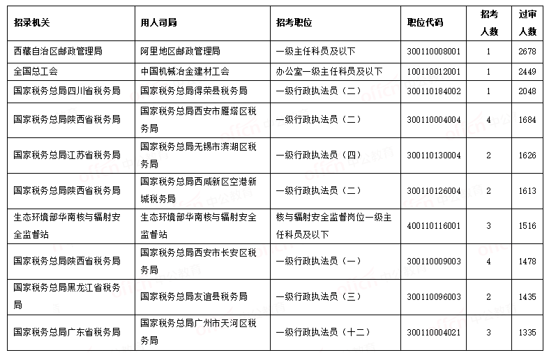 截至21日16时,突破千人过审的职位有27个,比去年同期多出4个,“西藏自治区邮政管理局阿里地区邮政管理局一级主任科员及以下”这一职位基本锁定“人气王冠”,以绝对性优势长期占据榜首之位,该职位招录1人,已经有2678人报名通过审核,还有6660处于待审状态,总报名人数已经接近一万人。由于该职位整体要求相对宽松,门槛较低,符合条件的考生较多,考生们要做好充足的准备。