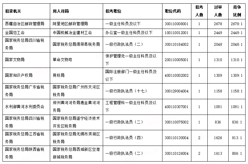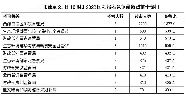 截至21日16时,竞争最激烈十大职位榜单中有七个已经超越“千里挑一”,竞争比例超越了1000:1,“西藏自治区邮政管理局阿里地区邮政管理局一级主任科员及以下”这一职位成为竞争比最高职位。