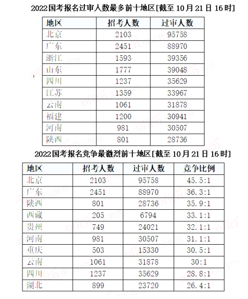 2022国考报名进行到第7天,各地报名人数也在持续上涨,人气地区前三甲分别为北京、广东和浙江,过审人数最多的自然是聚集了众多中央部门的首都——北京,目前已经接近10万人,平均竞争比为45.5:1,竞争激烈程度也让其他地区难以匹敌,报名过审人数高、竞争比例高,是名副其实的“双高”地区。