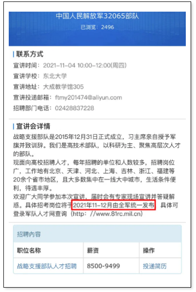 在战略支援部队32065部队的宣讲信息中,也提到了相关内容:具体招考岗位将于2021年11-12月由全军统一发布。具体如下图所示: