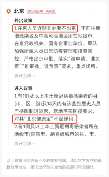 大家可以关注下自己报考点所在地区的出行防疫政策。以北京为例,目前北京的政策:非必要不出京,经过感染者所在县则不赋绿码。