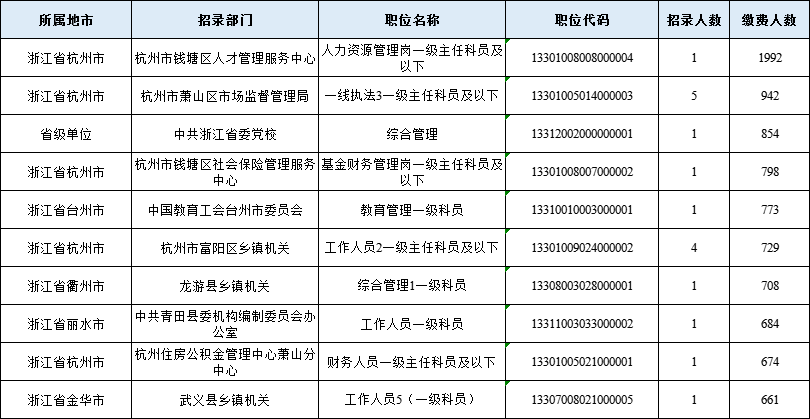 2022年浙江省考最终报名缴费人数最多的十大职位