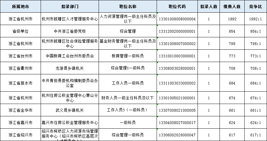 2022年浙江省考最终报名缴费人数竞争比最大的十大职位