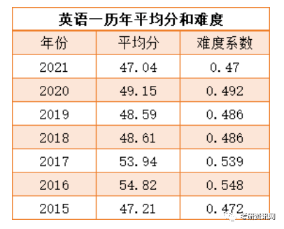 根据教育部发布的考试分析,2021年英语一全国平均分为47.04分。相对往年来说,比全国平均分仅低于1分多。