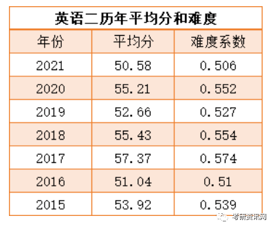 英语二的平均分能够很明显的看出最近三年的波动情况,2021年题目相对偏难,2021年英语二全国平均分为50.58分,相对往年来说,比全国平均分低了很多,说明难度确实增大了。