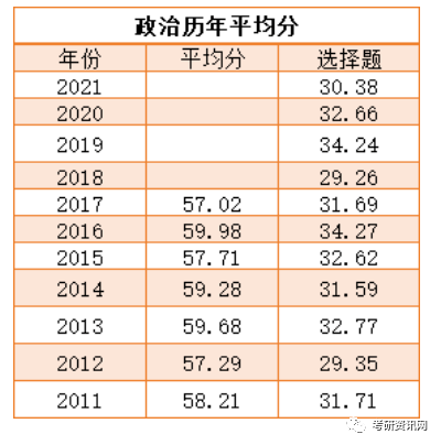 根据往年的数据,政治平均分基本在57~59分之间,难度系数属于中度难度,比较稳定,并不会出现剧烈的难度变化,因此大家可以按照近几年的考试真题难度进行准备即可。