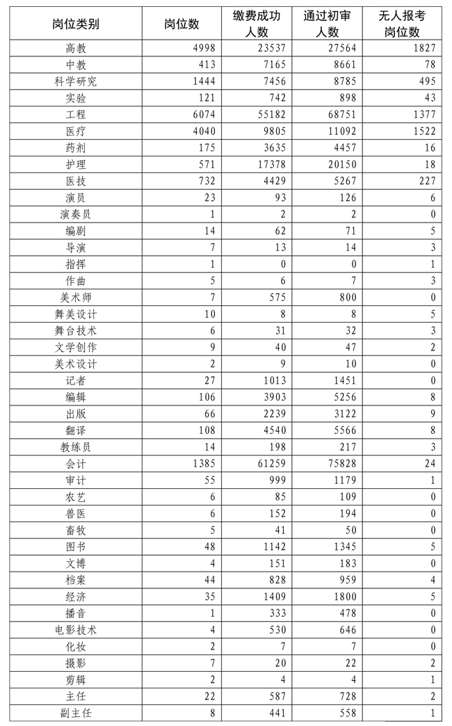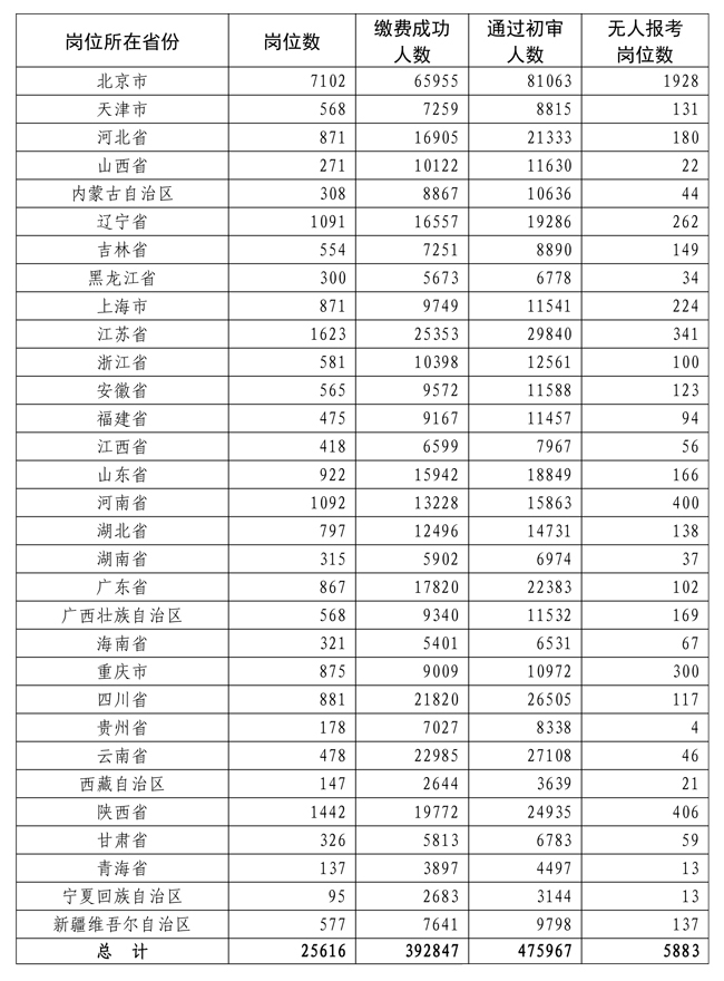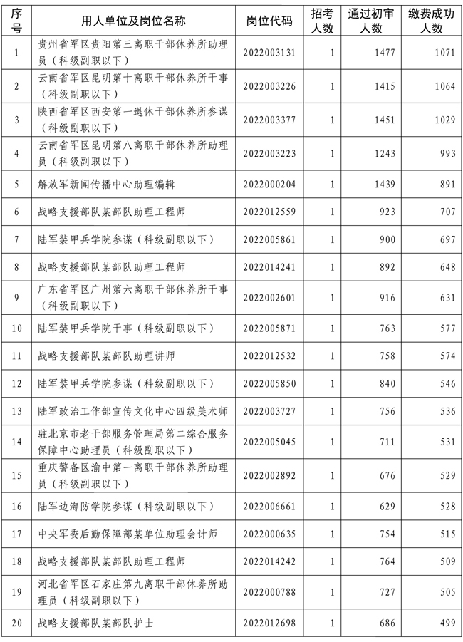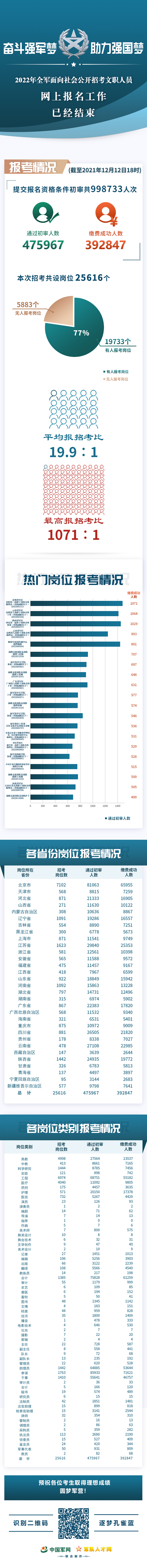 2022年全军面向社会公开招考文职人员网上报名工作已经结束。截至12月12日18时,提交报名资格条件初审共998733人次,通过初审的报考人员475967人,报名成功392847人。有人报考的岗位19733个、占77%,平均报招考比为19.9∶1,最高报招考比为1071∶1。