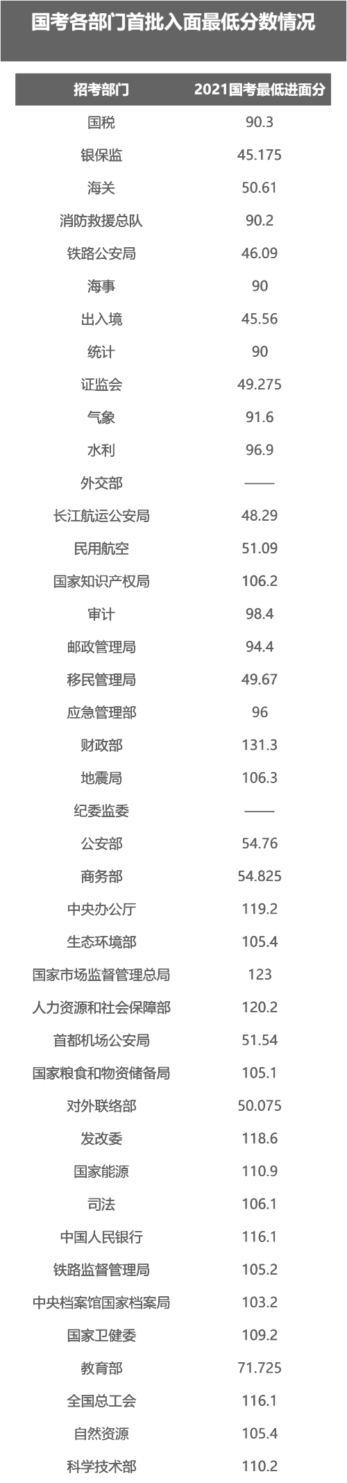 一、国考各部门首批入面最低分数情况