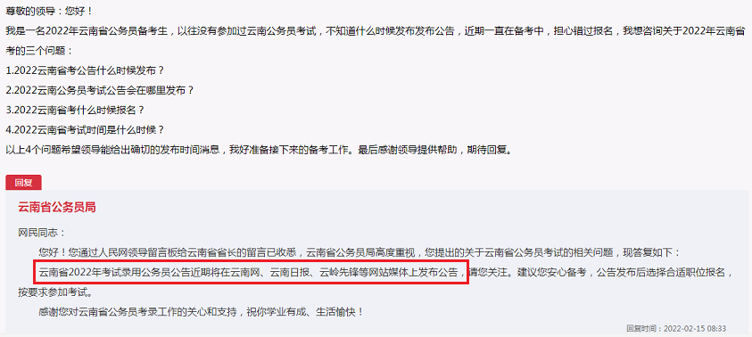 终于!2022年云南省考有消息了~日前,云南公务员局回复:2022年云南省考公告近期即将发布!