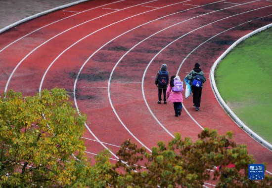 放学后,三名没有住校的听障学生走在校园的跑道上,准备与家长一同回家(2月23日摄)。