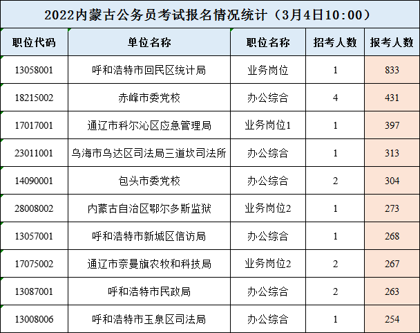 截至3月4日10:00,2022年内蒙古公务员考试已有75310人报名,79个岗位无人报考。