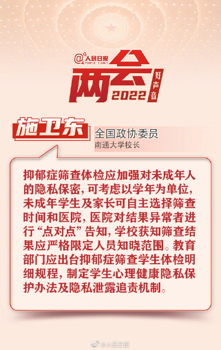 同样关注到青少年抑郁问题的,还有全国政协委员、南通大学校长施卫东。他提到,抑郁症筛查体检应加强对未成年人的隐私保密,可考虑以学年为单位,未成年学生及家长可自主选择筛查时间和医院,医院对结果异常者进行“点对点”告知,学校获知筛查结果应严格限定人员知晓范围。