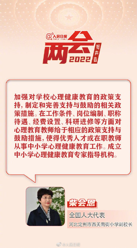 全国人大代表、河北定州市西关南街小学副校长柴会恩建议:加强对学校心理健康教育的政策支持,制定和完善支持与鼓励的相关政策措施。在工作条件、岗位编制、职称待遇、经费设置、科研进修等方面对心理教育教师给于相应的政策支持与鼓励措施,使得优秀人才或在职教师从事中小学心理健康教育工作。成立中小学心理健康教育专家指导机构。