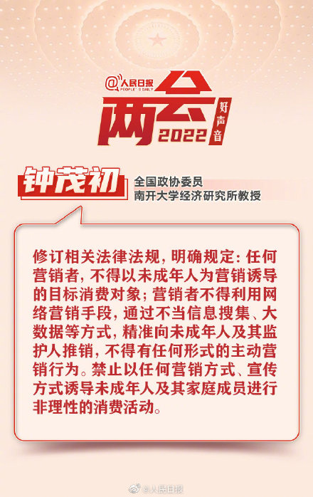 全国政协委员、南开大学经济研究所教授钟茂初建议,修订相关法律法规,明确规定任何营销者不得以未成年人为营销诱导的目标消费对象。