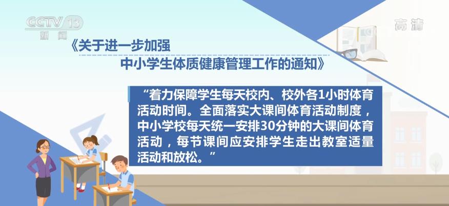 而《关于进一步加强中小学生体质健康管理工作的通知》,则进一步强调“着力保障学生每天校内、校外各1小时体育活动时间。全面落实大课间体育活动制度,中小学校每天统一安排30分钟的大课间体育活动,每节课间应安排学生走出教室适量活动和放松”。